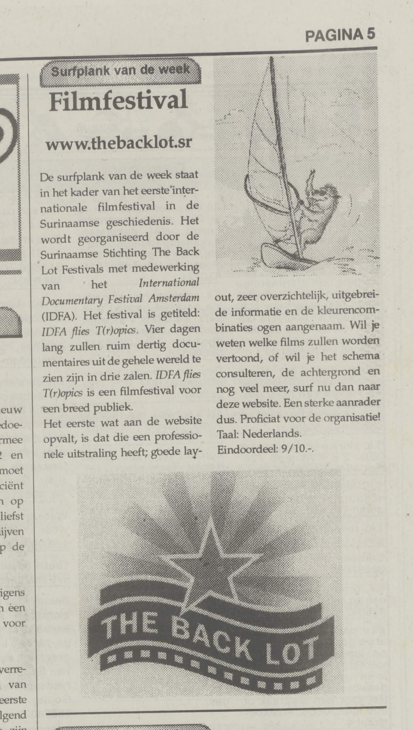 Op filmgebied ontwikkelt Suriname zich eveneens snel. Dankzij de inzet van The Back Lot zijn er via het Nederlandse Filmfonds documentaires geproduceerd in het kader van 50 jaar onafhankelijkheid.