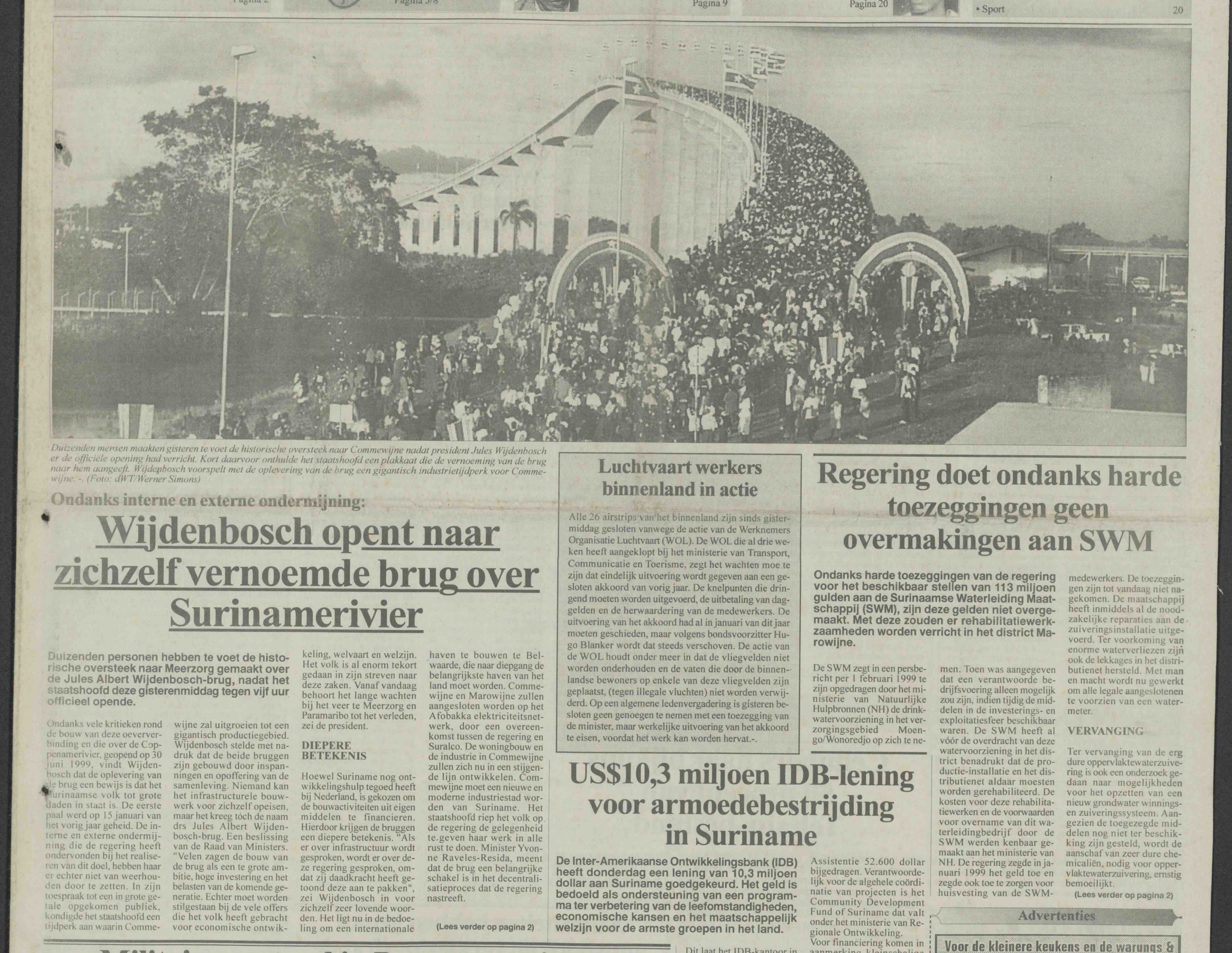 Tijdens de regeerperiode van Jules Wijdenbosch (1996-2000) zijn twee belangrijke bruggen gebouwd, die de ontsluiting van het kustgebied hebben bevorderd. In 1999 werd de brug over de Coppenamerivier opgeleverd. Hierdoor werd het mogelijk om vanuit district Nickerie zonder onderbreking naar de hoofdstad te rijden. Op 20 mei 2000, enkele dagen voor de vervroegde verkiezingen, werd de Jules Wijdenboschbrug over de Surinamerivier geopend. Hierdoor werd het mogelijk om van het westen naar het oosten te rijden zonder gebruik te hoeven maken van veerboten. Diverse regeringen hadden de bouw van een brug over de Surinamerivier op het programma, maar het lukte niet om het daadwerkelijk te realiseren. De voltooiing van de brug leidde ertoe dat vooral district Commewijne zich in hoog tempo ontwikkelde op het gebied van bewoning en bedrijvigheid. Veel bouwprojecten kwamen op gang omdat men de hoofdstad nu sneller kon bereiken. Ook verschillende handelsondernemingen vestigden zich in dit district.