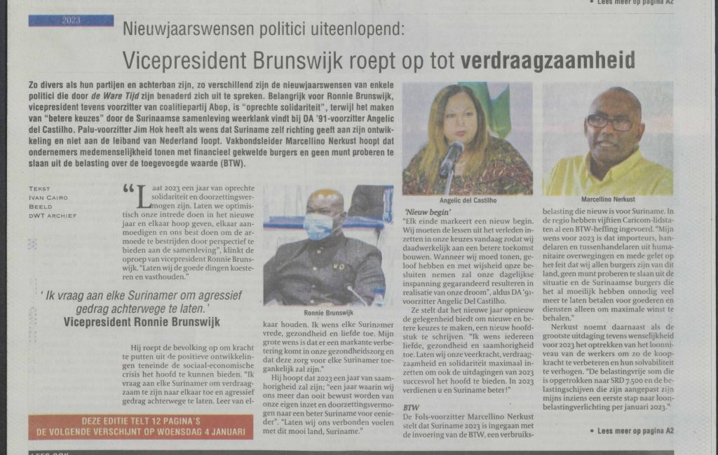 De Nationale Assemblee, het Surinaamse parlement, keurde net voor de jaarwisseling vier belastingwetten goed, waaronder de nieuwe Wet Belasting over de Toegevoegde Waarde (btw-wet). Ook de wetten op loon-, inkomsten- en casinobelasting werden goedgekeurd. De btw-wet werd ondanks veel twijfels en onduidelijkheden met 27 stemmen voor en 12 tegen aangenomen in het parlement. Zij vervangt de Wet Omzetbelasting en is vanaf 1 januari 2023 ingevoerd met een btw-tarief van 10 procent. Vanwege de btw hoeven werknemers minder loonbelasting te betalen, zodat hun koopkracht minder daalt. De belastingvrije grens is verhoogd naar 7.500 Surinaamse dollars per maand en ook de belastingschijven zijn aangepast. De nieuwe en gewijzigde belastingwetten helpen de overheidsbegroting voor 2023 op orde te krijgen. Suriname moet de overheidsinkomsten verhogen om te voldoen aan de eisen van het IMF voor financiële hulp.