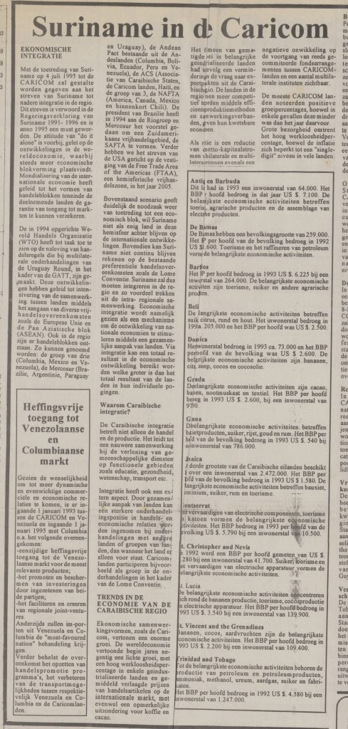 Op 4 juli 1995 trad Suriname toe tot de Caribbean Community (CARICOM). De CARICOM begon met de ondertekening van het Chaguaramas-verdrag op 4 juli 1973, dat destijds werd getekend door de premiers van Guyana, Barbados, Jamaica en Trinidad and Tobago. In de jaren ‘90 nam Suriname bijzondere stappen om zijn economie open te stellen voor de wereld, maar in het bijzonder voor het westelijk halfrond. Concrete initiatieven werden genomen om de economische samenwerkingen tussen Suriname en zijn regio te versterken. Het integratieproces om economisch en diplomatiek onderdeel te zijn van de regio kwam op gang. Suriname trad in 1994 ook toe tot de Association of Caribbean States (ACS) en sloot verschillende vrijhandelsovereenkomsten met landen als Brazilië en Venezuela. Integratie stond nadrukkelijk op de voorgrond binnen de nationale visie voor de toekomst van het land.